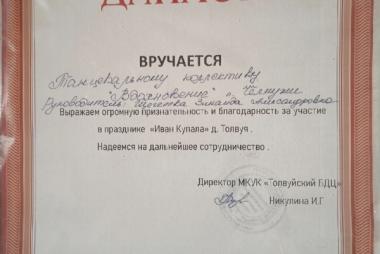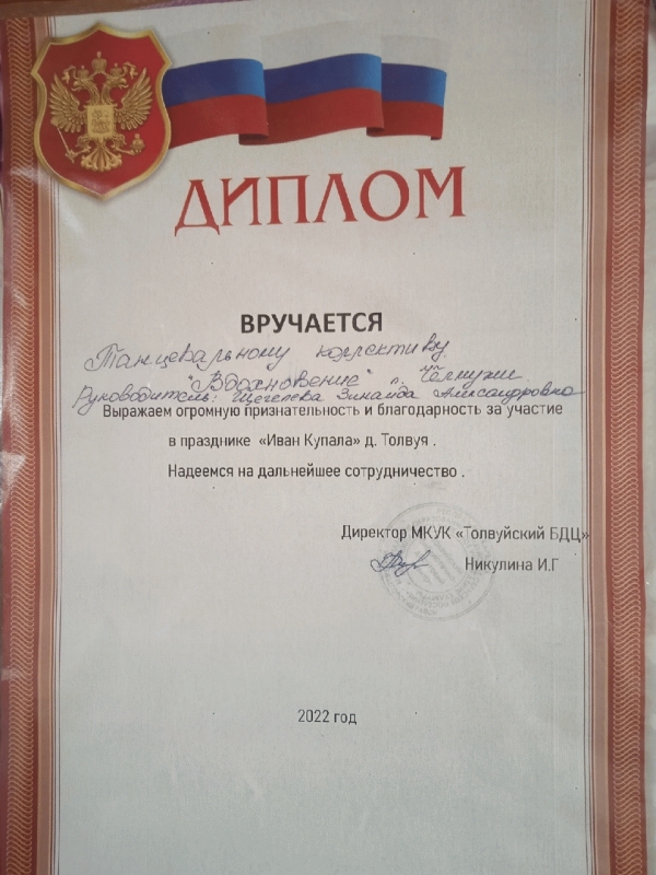 В июле 2022 года , по приглашению директора Толвуйского БДЦ Никулиной Ирины, танцевальный  коллектив " Вдохновение" выступил со своими тремя танцами на празднике " Ночь Ивана Купала"